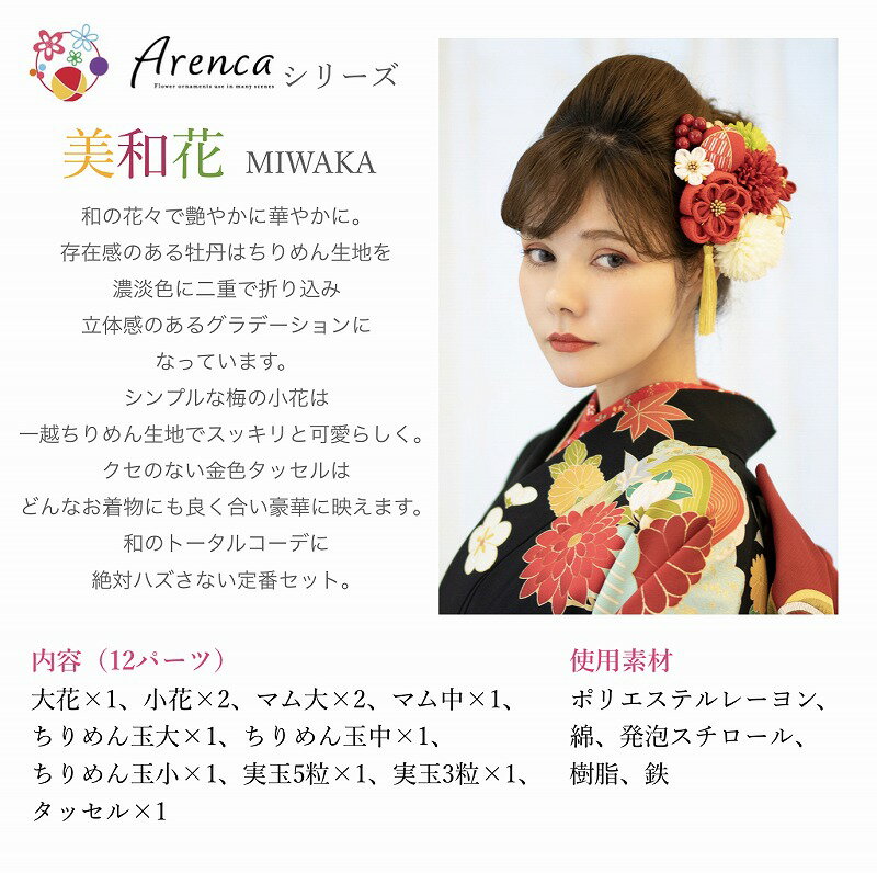 品名美和花 5collar使用素材ポリエステルレーヨン、綿、発砲スチロール、樹脂、、鉄内容大花×1(花径6cm) 小花×1(花径3.5cm) マム大×2(花径6cm) マム中×1(花径4.5cm) ちりめん玉大×1(玉径6cm) ちりめん玉中×1(玉径5cm) ちりめん玉小×1(玉径4cm) 実玉5粒×1(玉径1cm) 実玉3粒×1(玉径1cm) タッセル×1(長さ7.5cm)注意事項■商品の撮影には最大限注意を払っておりますが、閲覧時のモニター環境によりましては実際の商品と若干違うお色味に映ることもございます。